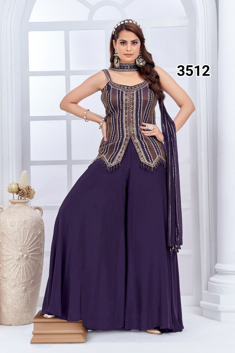 Royal Purple flowy Palazzo set featuring a heavily embroidered strappy short kurta top with scalloped tassel hem. Paired with wide leg flowy pants that almost look like skirt, made in faux crepe silk and matching choker dupatta.